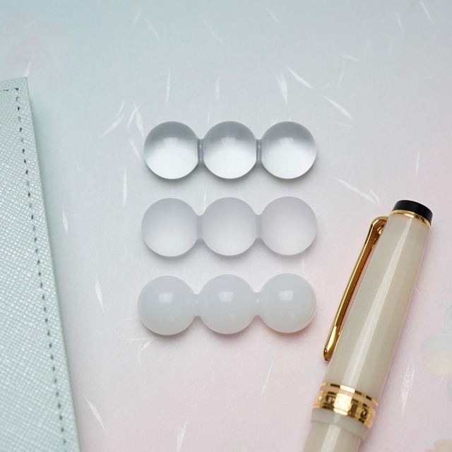 万年筆やガラスペン等の愛用品を一時的に休ませる為のペン置きです。 タイプ:3粒 サイズ:横44mm、縦15mm、高さ約12mm 素材:UVレジン 1番ベーシックなクリア、フロスト、ホワイトです。 【クリア】透明でどんな万年筆でも自然に馴染みます。 【フロスト】すりガラスの様なマット感があり上品な雰囲気になります。 【ホワイト】白い背景やノートとの相性が良いです。 筆記途中のちょっとしたタイミングに置いて頂いたり、次のペンへの交換の際などにお使いください。 机に向かって筆記をする事で様々なアイデアが生まれる場面で、少しでもそのお手伝いが出来ればと、アイデアの種という意味を込めて【seed】と名付けました。 卓上でインテリアとしても楽しんで頂ける様にコロンと可愛らしい見た目に仕上げました。 底を平らにしてあるので安定性も抜群です。また底部分には滑り止め加工も付けているので滑りやすい素材のテーブルに置いた時に動きにくい仕様になっております。 お気に入りの万年筆やインクに似たお色で合わせて頂いたり、金具のお色味で合わせたり、配色でお楽しみ頂いたり、楽しみ方は無限大です! もちろん万年筆以外にもボールペンや、ネイル用のブラシ置きとしてもお使い頂けます! SNS等に万年筆をアップする際の撮影にもペンレストとして可愛くお使い頂けます。 ※手作業の為、多少の傷や色合いのムラ、中に気泡が入っている等が御座いますので予めご了承ください。 ※高い位置から落としたり硬い所にあたった際に粒同士が割れる可能性が御座いますので、落下等には十分にお気を付けください。 ※裏の滑り止めにホコリ等が付着した場合は優しく洗い流して頂ければ取れますので、是非お試しください。